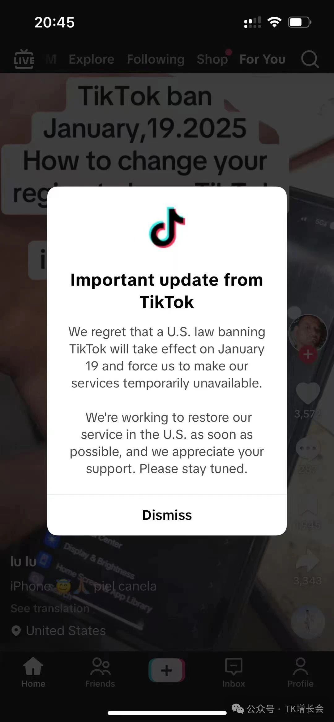 就在刚刚,TikTok向美区用户弹窗官宣,将在19日暂停服务,并表示将努力尽快恢复服务。