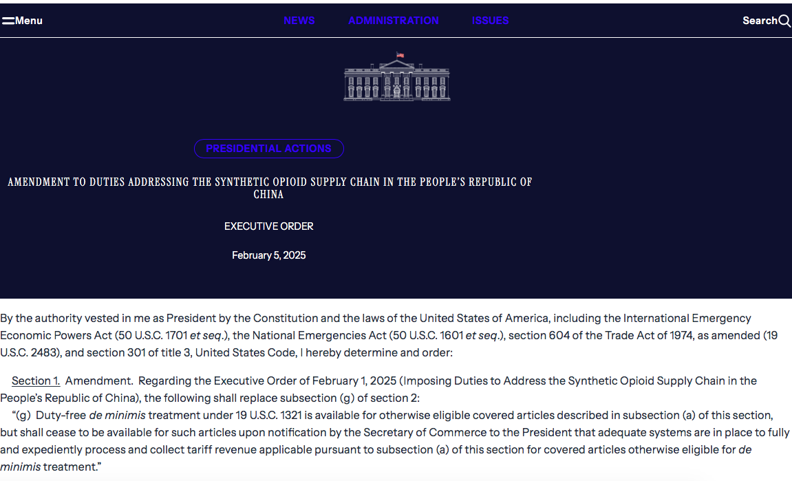 美国总统特朗普2月1日签署行政令,对进口自中国的商品加征10%的关税。此外,美国还规定小包裹的最低限度(de minimis)豁免不再适用。