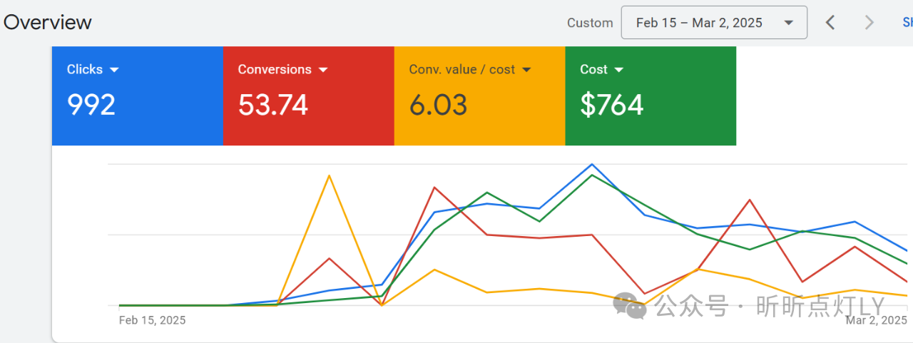 在上面截图的对话中,我举了个例子,2月18日新上的一个PMax广告系列,一个组只放1个产品,目前来说效果还不错。