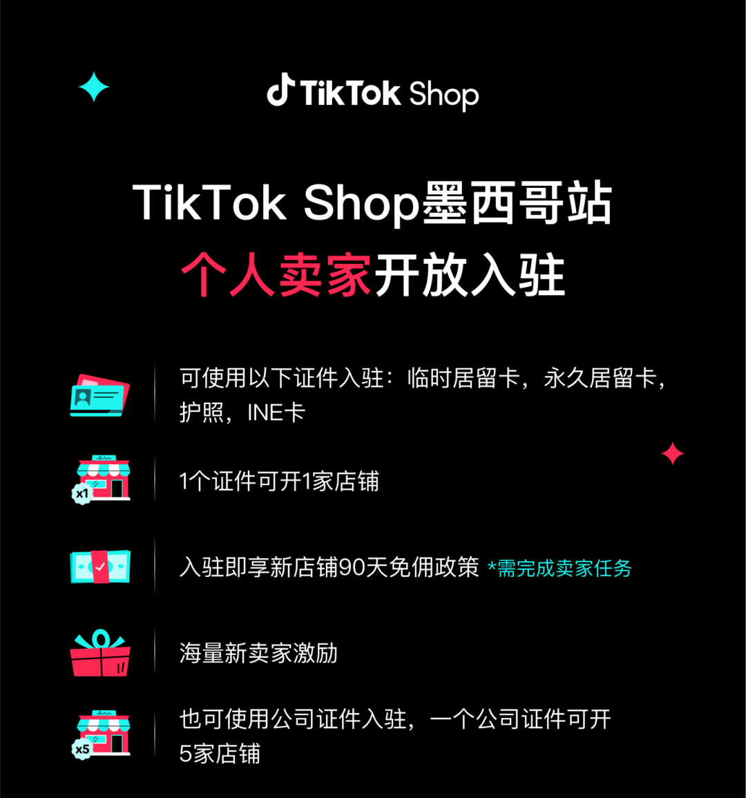 TikTok Shop墨西哥站继2月13日正式开卖后,在墨西哥时间3月4日(中国时间3月5日)开放个人卖家入驻通道,需满足以下条件: