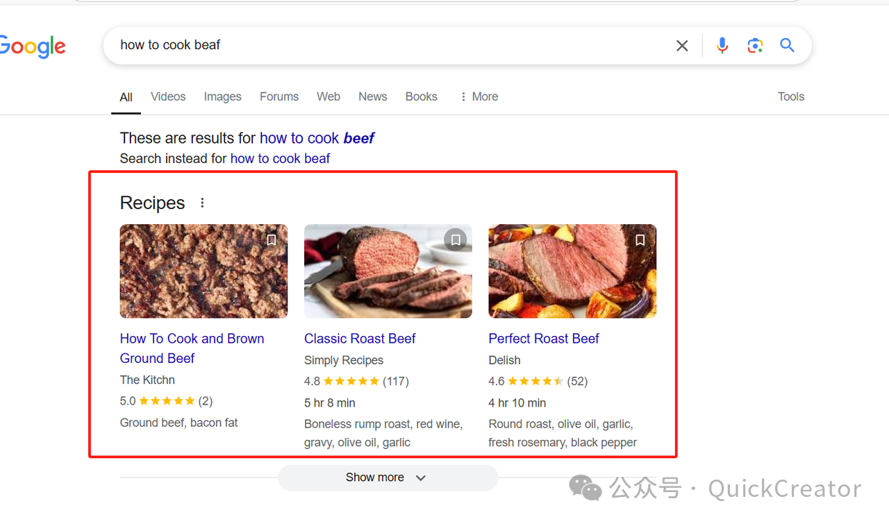 在谷歌中,结构化标记经常也会有更好的富文本表现形式,如菜单类型的结果: