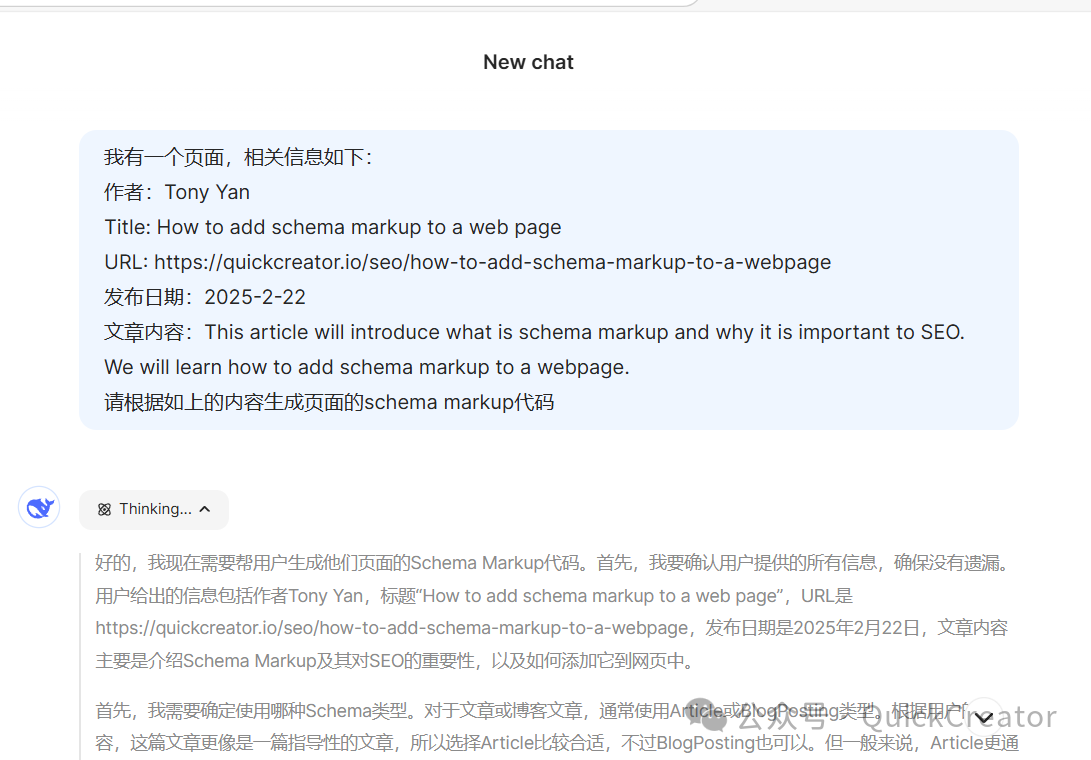 然后,DeepSeek就会根据我的要求来生成页面的schema markup代码了。
