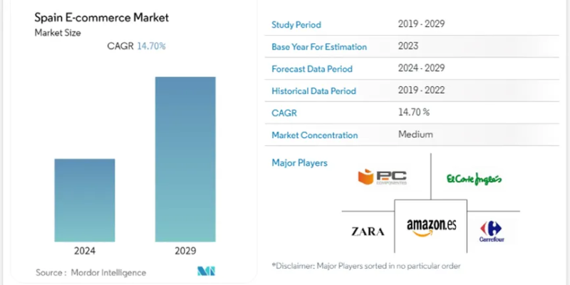行业研究机构Statista预测,至2029年西班牙电商市场规模将突破564.6亿美元,年均复合增长率保持高位。