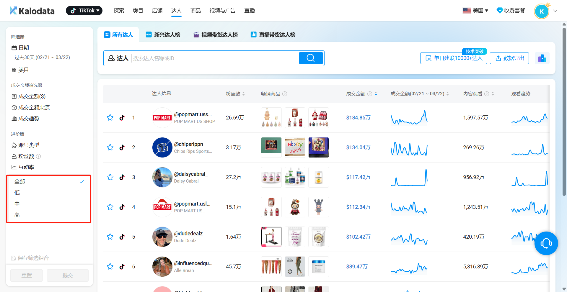 另外,你可以直接在Kalodata的达人榜单中,找到自己行业中高互动率的创作者,分析他们的内容类型,并在养号期间多刷他们的视频,加快账号标签的建立。