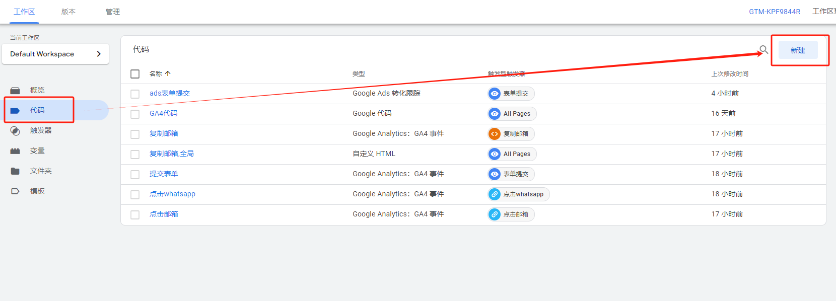 这个AW代码起到的连接的作用,相当于一个全局的代码,跟安装GA4时候的的全局代码一个意思。在GTM后台,左侧边栏找到代码,点击新建