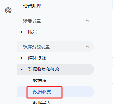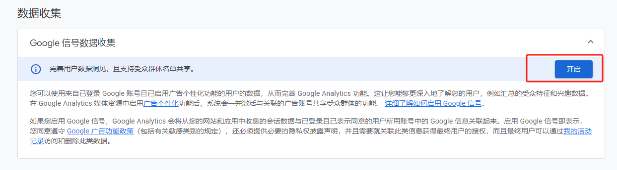 进入GA4后台,在左侧边栏数据收集和修改这里,找到数据收集。第一个Google信号收集点击开启。