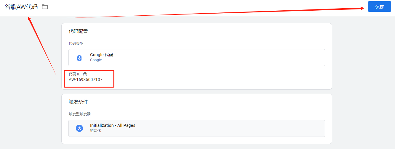 这里有一个代码ID,这个ID其实就是你的谷歌广告账户前面加一个AW-,当然我们也可以找到它。