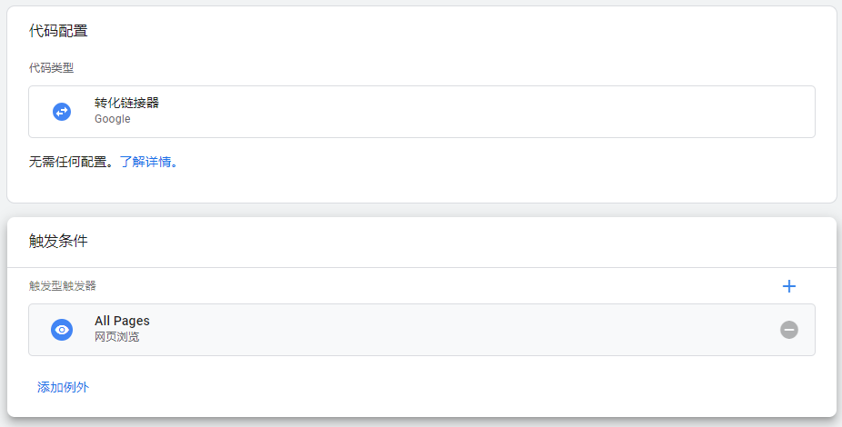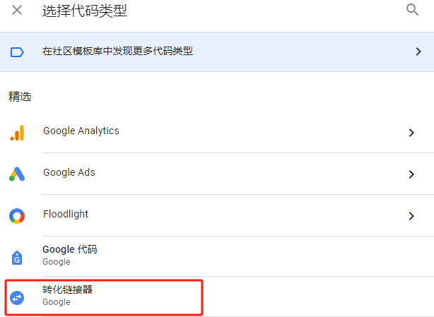 在没有更新前,我们在安装Google ads代码时,会自动弹出来让我们先安装这个代码转化器,现在我们需要手动的去安装一下。同样在GTM后台,找到代码,选择新建代码,代码类型选择转化连接器