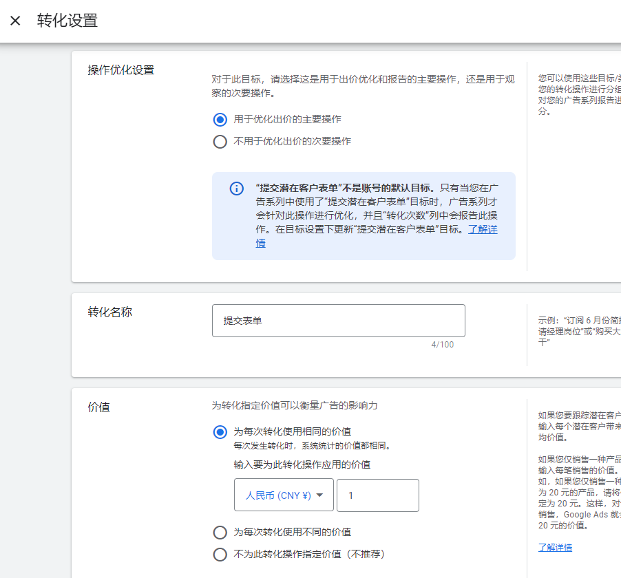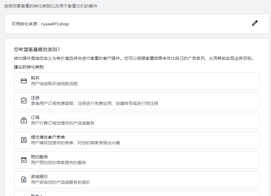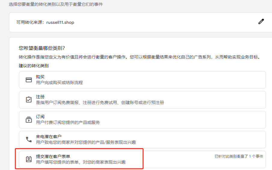 在选择转化类别这里,可以根据你的需求去选择,比如我想要追踪表单提交这个转化,那就选择提交潜在客户表单这一类别