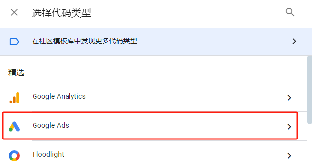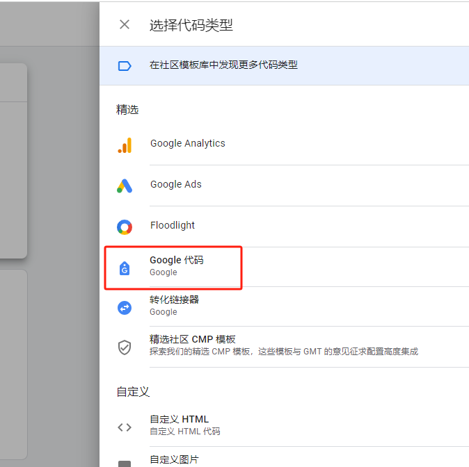 这里我直接就将如何安装最后的这个代码,同样在GTM后台选择代码,新建代码,代码类型选择Google ads