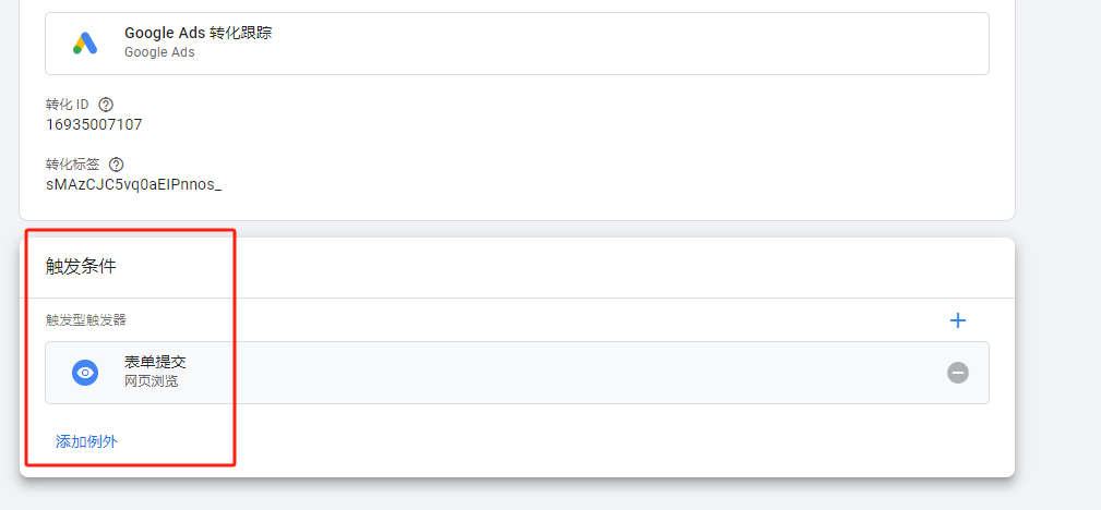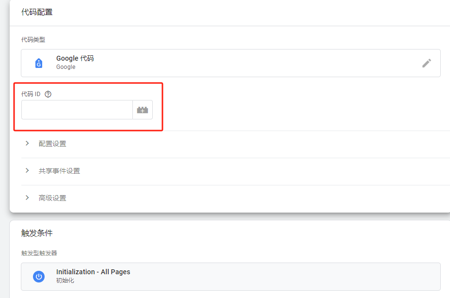 这里的代码设置这里,有一个转化ID和转化标签,这里就填写之前我们复制的转化ID及标签。(安装Google AW代码的前一步截图中)