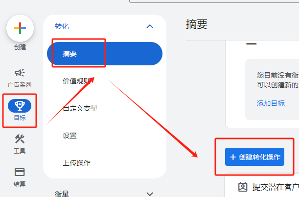 接下来我来演示一下如何将GA4事件导入到ADS,这里更新后的操作和之前有一些区别了。同样在ADS后台,点击目标,选择转化中的摘要,点击创建转化操作。