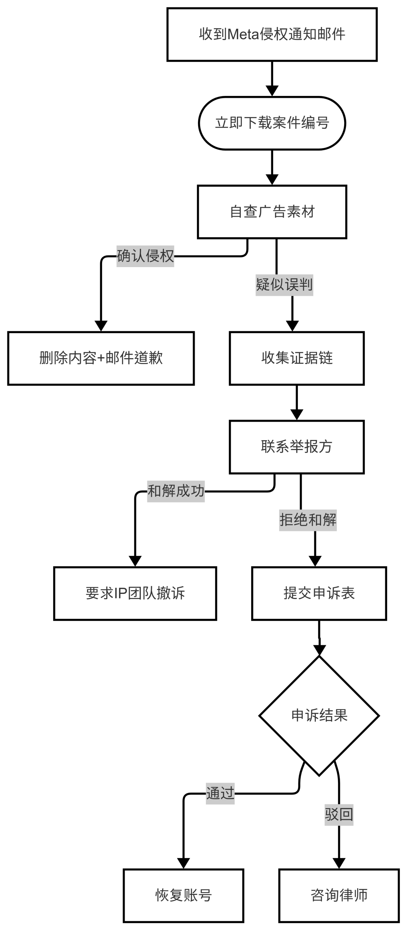 正文模板: Dear Meta IP Team, 我们已收到关于Case #XXXXX的侵权指控。经核查,产品的图片、以及广告素材,都是我们自己设计的(附设计稿扫描件)。视频中的[具体元素,如背景音乐]源自[XX平台]正版库(附购买凭证)。且已经和举报方达成和解,以下是撤诉id #XXXXX。恳请重新审核,谢谢! Best regards, [您的姓名] [公司名称] [联系方式]