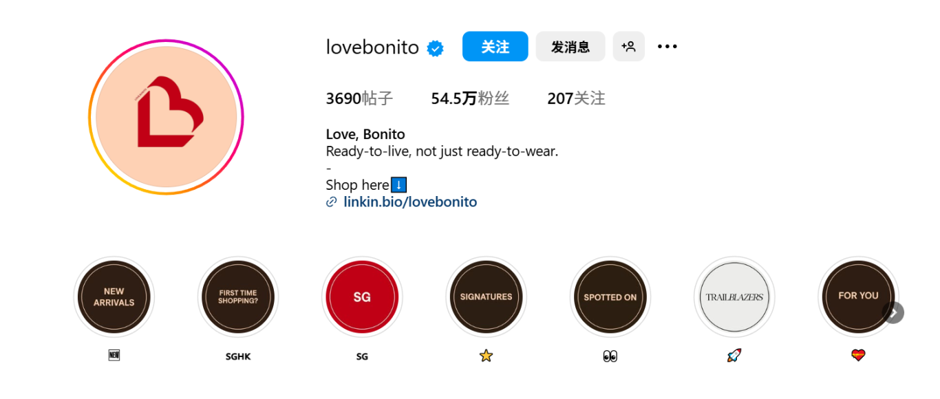 多年来,Love, Bonito在多个社交平台进行不同策略的测试,Instagram是潜在客户最常光顾的社交媒体平台,拥有最多的关注用户。迄今为止,Love, Bonito 的 Instagram 页面拥有54.5万名粉丝,是该公司最具吸引力的社交媒体平台。