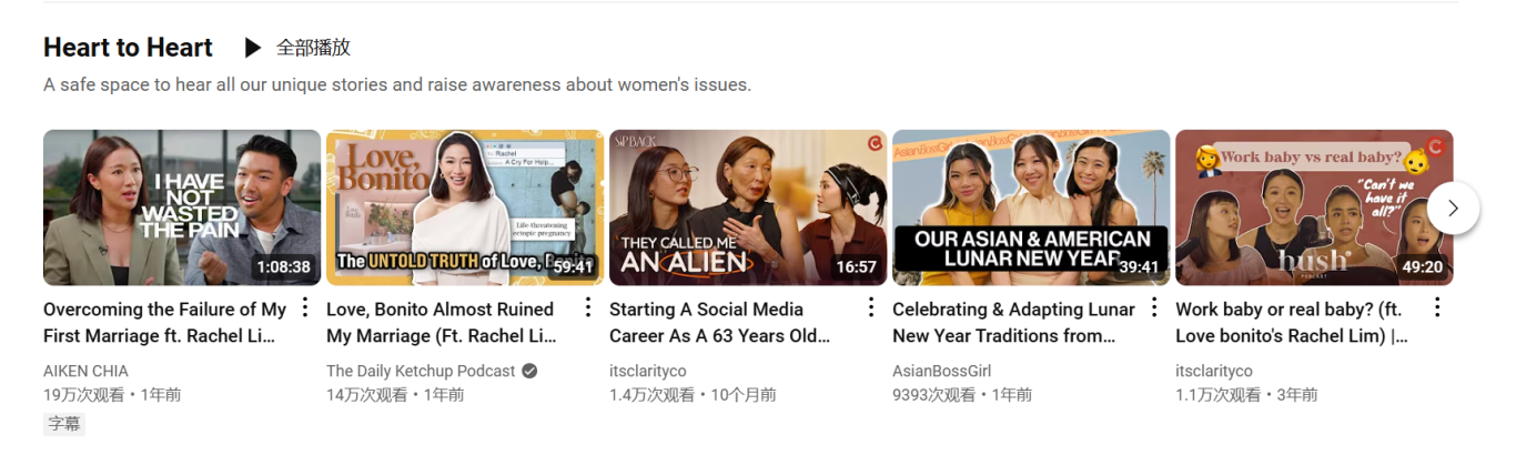 此外,视频内容营销也是Love, Bonito提升品牌价值的重要策略之一。它并没有采用直白的产品营销方式,而是制作能引起目标受众共鸣的励志视频。在YouTube的运营中包括了多样化的内容,如名人合作、品牌故事、幕后制作、生活方式分享、女性话题、互动社区和跨平台推广等形式来吸引不同兴趣的观众,以此提升品牌认同感及形象。