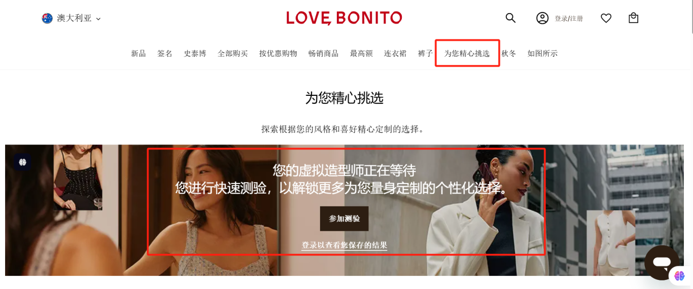 用户在网站上可以通过“Curated for you”,只要回答几个关键问题就可以获得虚拟造型师的推荐搭配,如喜欢的风格、最想突出自己身体的哪个部位、喜欢哪种剪裁、个人尺码,最终就能获得一系列的服装推荐、包含裙装、套装、上下装等,用户只需点击下单购买即可,整体购物非常便捷快速、用户体验良好。通过结合AI和数据化管理,使品牌在个性化运营和用户体验方面独具优势。