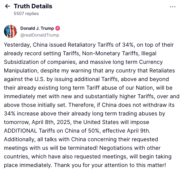 据外媒报道,特朗普在社交媒体发文称,如果中国没有在4月8日撤销对美国加征34%关税的反制措施,美国将从4月9日起对中国商品额外加征50%的关税。