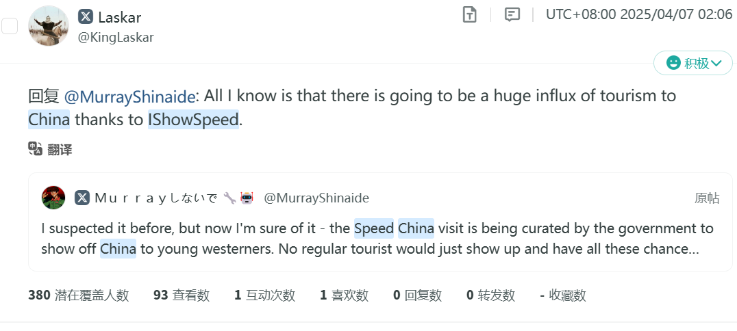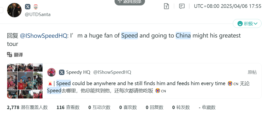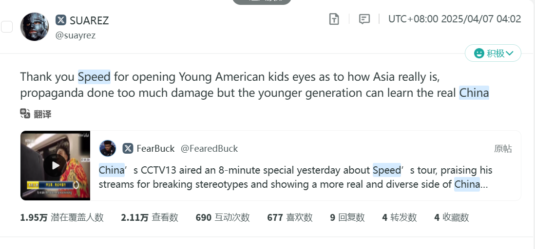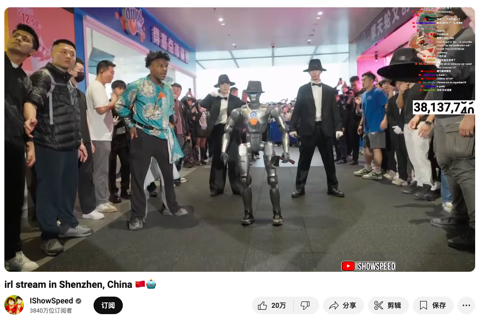 海外社媒千万粉丝顶流网红IShowSpeed(以下简称Speed)自3月24日起开启中国行,凭借无脚本、高互动的直播形式,在YouTube等社交媒体引发空前热度。