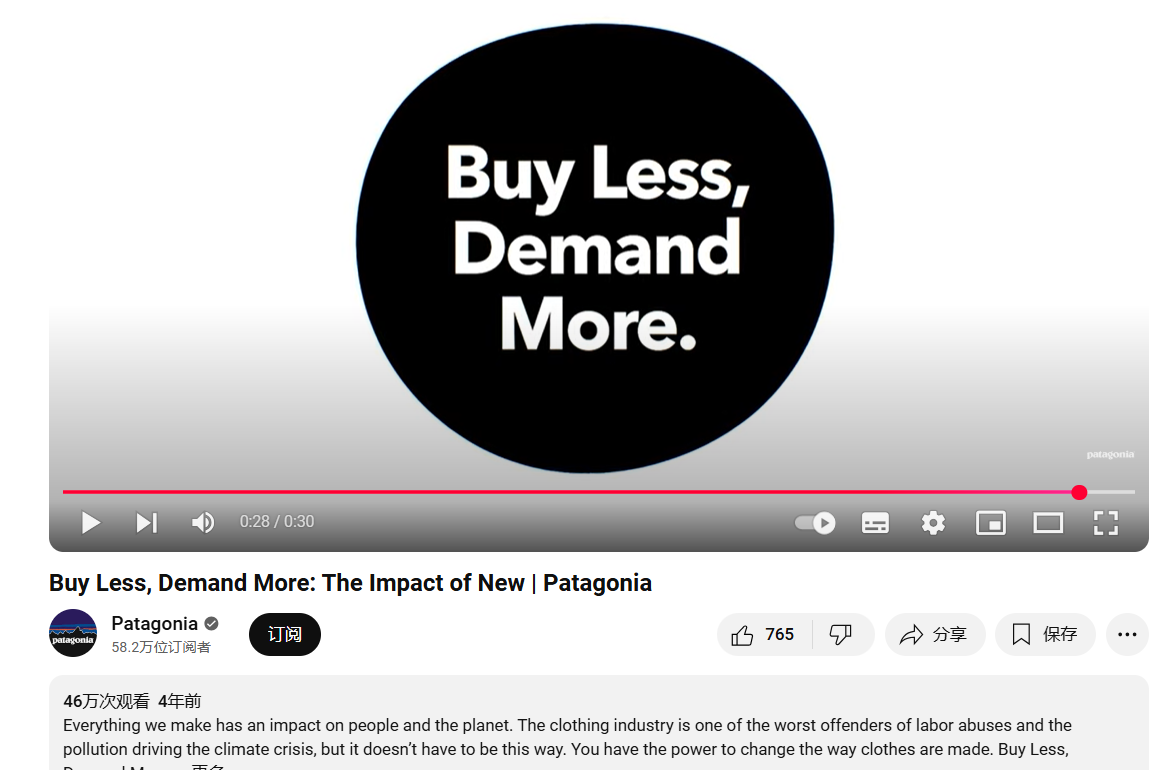 美国户外品牌Patagonia曾发起“不要买这件夹克”(Don’t Buy This Jacket)活动,主动揭露生产过程中对环境的破坏:从羊毛采集的水资源消耗到化纤材质的微塑料污染,全部公开展示。他们也曾以“Buy Less, Demand more”作为宣传标语,直言服装行业是导致气候危机最严重的行业之一。这种“自曝短板”的逆向操作,反而让用户感受到品牌的真诚并且增强信任感。