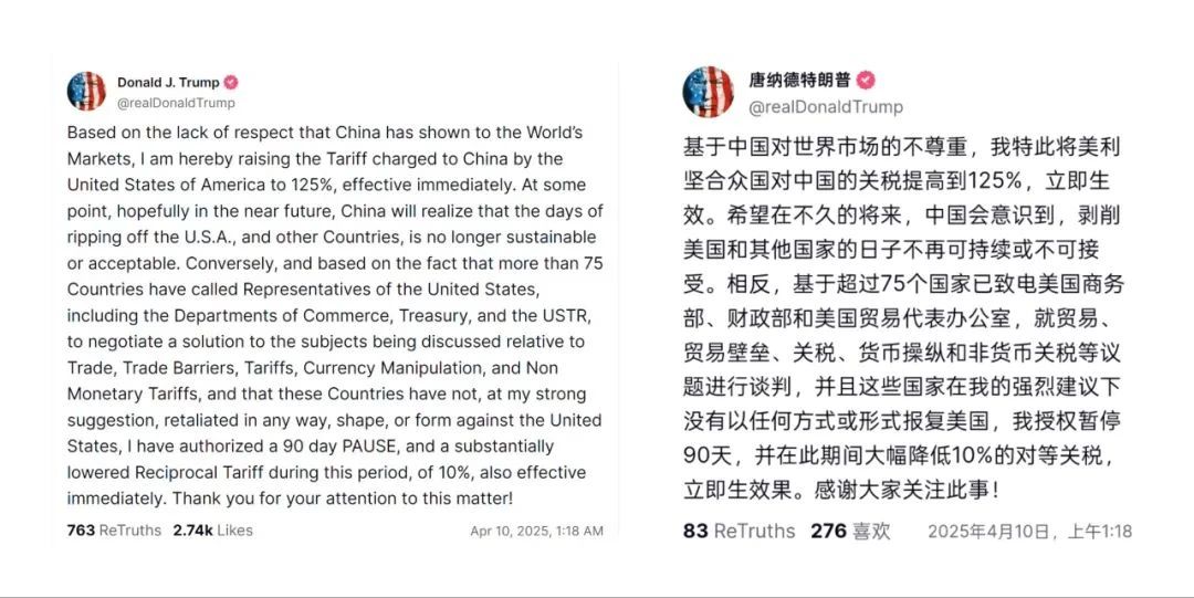 美国东部时间2025年4月10日凌晨,特朗普在其个人社交平台上发布的一则消息再度震动了全球:美国决定对原产于中国的进口商品的关税提高到125%,立即生效。