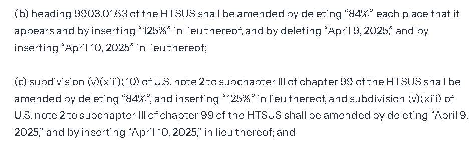 然而,当地时间 4 月 10 日,白宫发布正式公告《修改互惠关税税率以反映贸易伙伴的报复和协调》官员,并“修正”说法称,4 月 9 日特朗普宣布的 125% 税率仅为“对等关税”部分,叠加此前因芬太尼问题对中国商品额外加征的两轮 10% 关税,现下美国对进口自中国的商品实际加征的综合关税税率应为 145%。