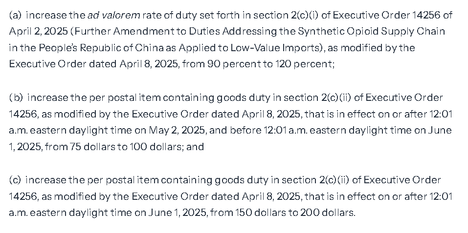 ·自 5 月 2 日起,对来自中国大陆及香港、货值不超过 800 美元的包裹,将征收其货值的 120% 或每件 100 美元的关税(此前为 90% 或 75 美元);