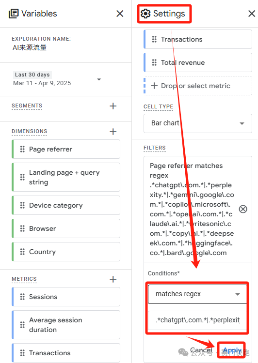 Note:如上这一个条件表示的是,推荐流量来源为chatgpt, perplexity, gemini, copilot, openai, claude, writesonic, copy ai, deepseek, huggingface的流量,则被统一归为我们新设置的AI流量来源渠道。