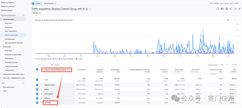 于是,我们就可以在Traffic acquisition报告中,切换刚才新建&命名为“Channel Group with AI”的流量渠道组,并看到来自于AI平台的流量了。
