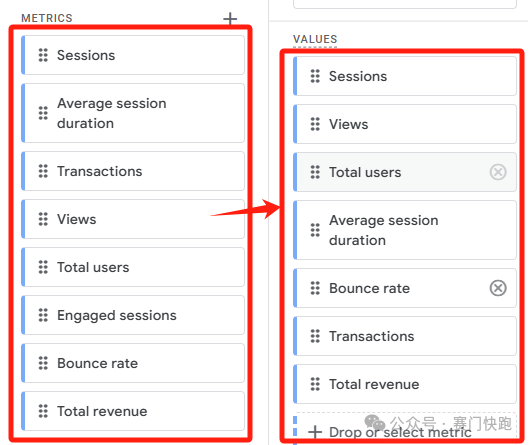 本示例中,我添加了Sessions,Views,Total users, Average session duration, Bounce rate, Transaction, Total revenue七个指标。