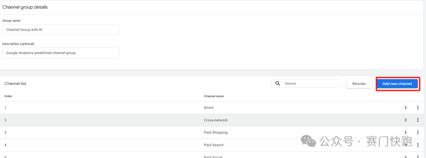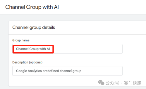 第二步,点击刚才复制出来的默认渠道组,为它填写一个新命名,例如:Channel Group with AI。