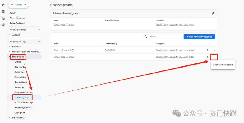 第一步,点击GA4左下角的Admin进入到管理员后台,依次点击Data Display->Channel Group,然后在已有的默认渠道组右侧,点击三个小点,然后选择Copy to create new。
