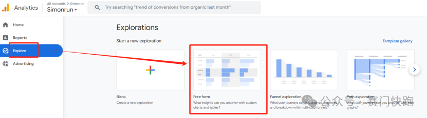 第一步,在左侧菜单栏点击Explore,并在右侧选择Free form形式来开始创建自定义报告。
