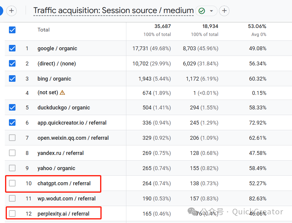 在这个结果中,来自ChatGPT的流量为第十,来自Perplexity的流量为第12,占比都不到1%。
