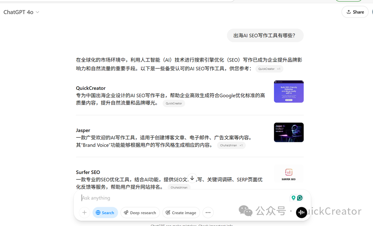 比如,我在ChatGPT 4o中,提问出海AI SEO写作工具有哪些,会得到如下的结果: