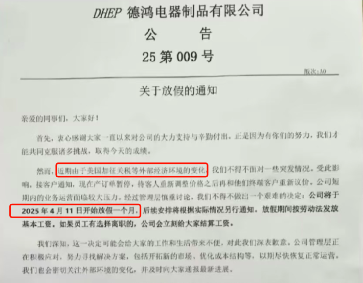 4月9日,东莞市德鸿电器制品有限公司宣布停产放假一个月的通知文件在网上被曝出,引发外界的广泛关注和讨论。通知称,由于美国调整关税政策,再叠加当前经济环境影响,公司不得不面对一些突发情况。受此影响,公司已收到客户取消订单的通知,新的议价方案正在调整之中,这导致公司短期内面临较大的经营压力。