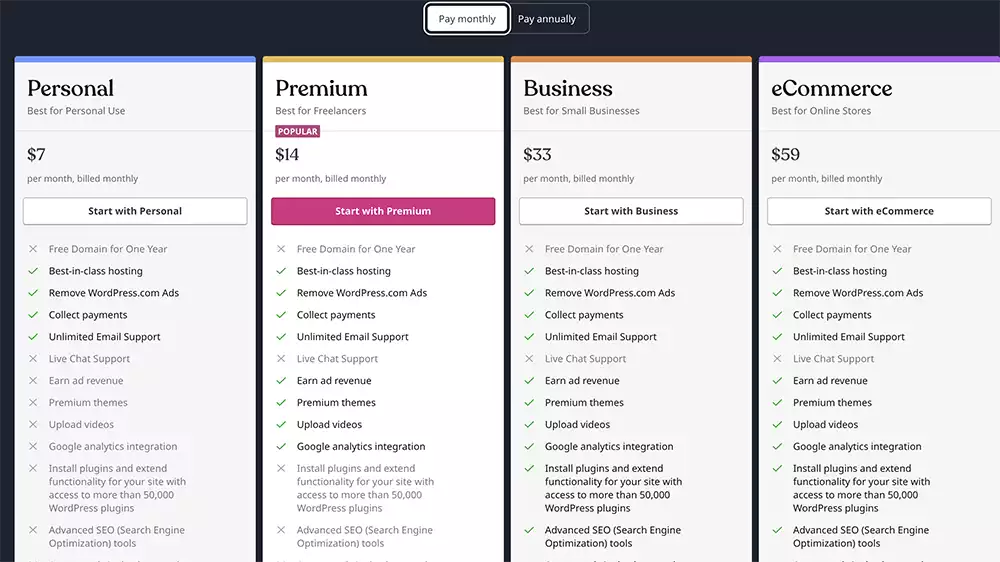 免费的WordPress.com也会带着WordPress.com的链接,如果移除,就需要升级你的账号成为会员。会员分为Personal和Premium两种。另外呢,WordPress.com有非常多的限制,你没有办法自由使用WordPress所有的主题和插件,即使升级了你的WordPress.com账号,你也只能使用套餐权限以内的主题和插件,自由度就差很多了。