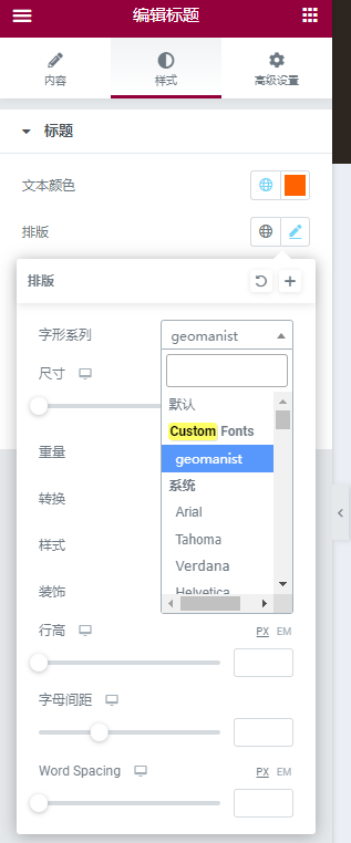 然后我们在Elementor编辑器设计网页的时候,就可以在字库里的custom font文件夹找到我上传的geomanist字体啦。