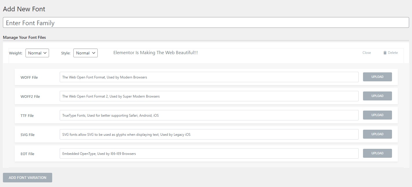打开Elementor的custom font面板,点击Add New新建字体geomanist, 然后就可以上传不同格式的字体文件。