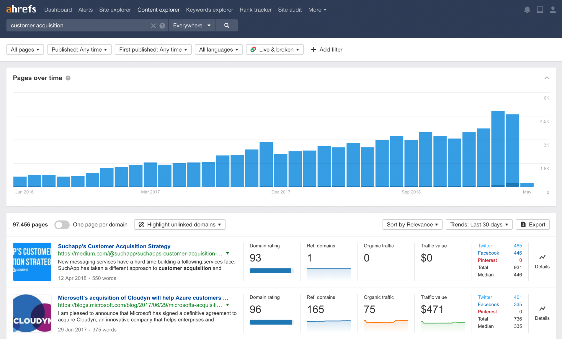 每个SEOer必备的网站内容挖掘工具,Ahrefs Content Explorer你不得不学会。进入Ahrefs后台,后天点击Ahrefs Content Explorer,输入你的关键词开始进行内容挖掘。这个功能和Buzzsumo功能很相似,可以分析出哪个话题,哪个内容最火最热门。