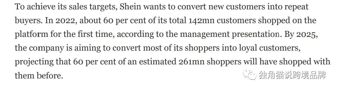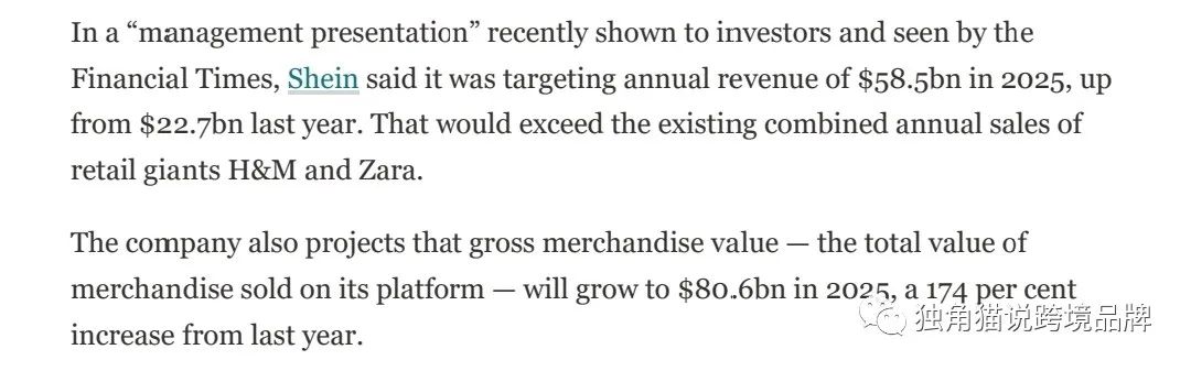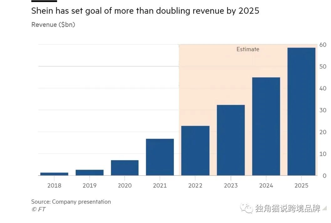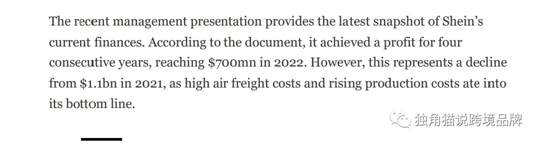 根据这篇报道的其他内容,小猫大概总结了一下:shein2021年营收约200亿美金,利润11亿;2022年由于一些不可抗力,大概收入300亿美金,利润7亿。在财务预测中,2025年要做到600亿收入,75亿利润。