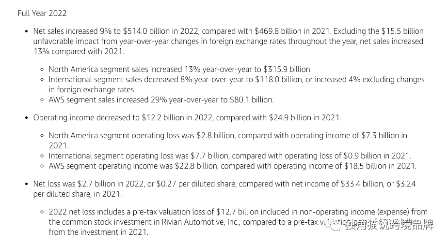 根据亚马逊2022年财报,22年连亚马逊都出现了罕见的27亿美金亏损。虽然这个亏损里面包括计提了对Rivian的投资损失,不能完全算它自己的运营亏损,但总体来说,近年来互联网平台模式遇到的问题一样不小。
