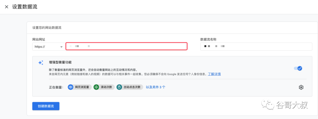 第五步:设置数据流》输入网站网址+数据流名称命名》点击创建数据流