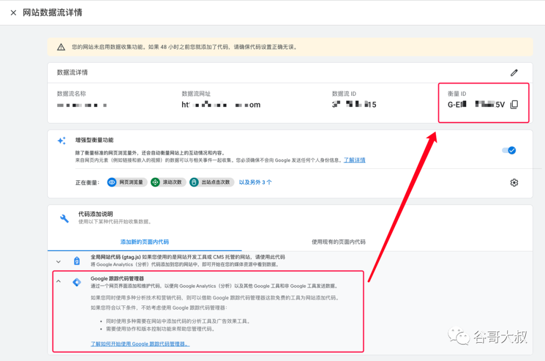 第六步:网站数据流详情里面会出现代码添加说明,网站上添加上以下某种代码就可以在Google Analytics工具内收集网站流量和数据。这里有两种代码添加说明:全局网站代码(gtag.js)和Google跟踪代码管理器。