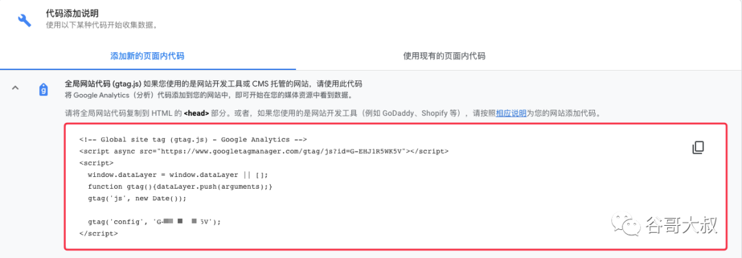 如果是谷歌大叔团队建设的网站,后台已预留接口,填入“数据流ID” 即可完成代码部署。