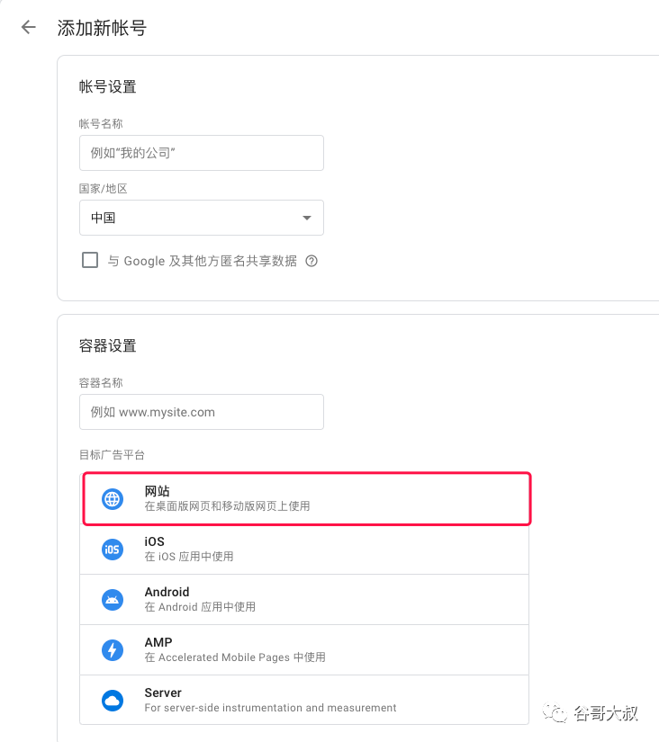 第一步是创建GTM账户:https://tagmanager.google.com/#/home》登陆之后》点击创建账号create account》添加新账号add a new account:账户设置+选择目标广告平台,然后点击创建