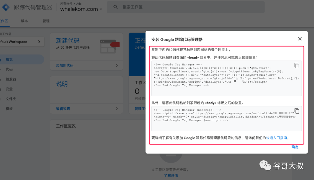 进入跟踪代码管理器账户之后就出来安装Google跟踪代码管理器了,复制出现的两段代码粘贴到你网站的每个网页上,这里每段代码的安装都有详细的说明。
