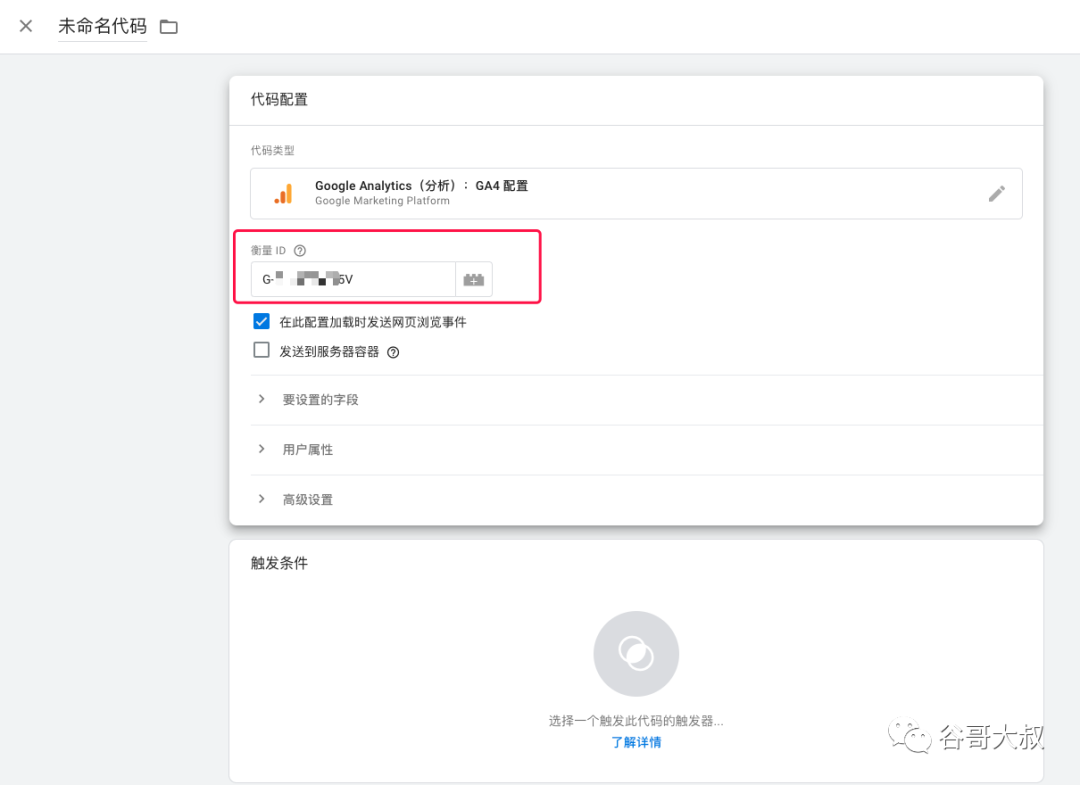 复制衡量ID,粘贴到衡量ID空白处,触发条件选择All pages(网页浏览),代码重命名,保存