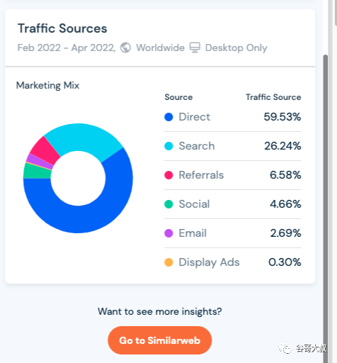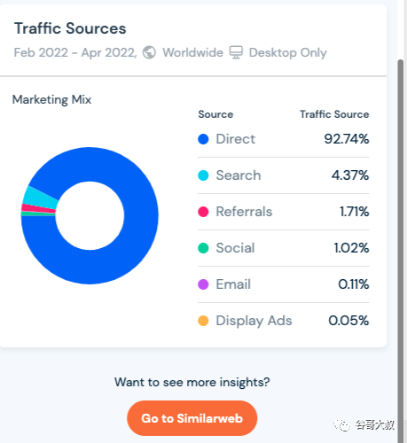 用SimilarWeb工具的好处是不用安装谷歌分析账户就能看到自己网站和别家网站的渠道来源,而且是免费的。