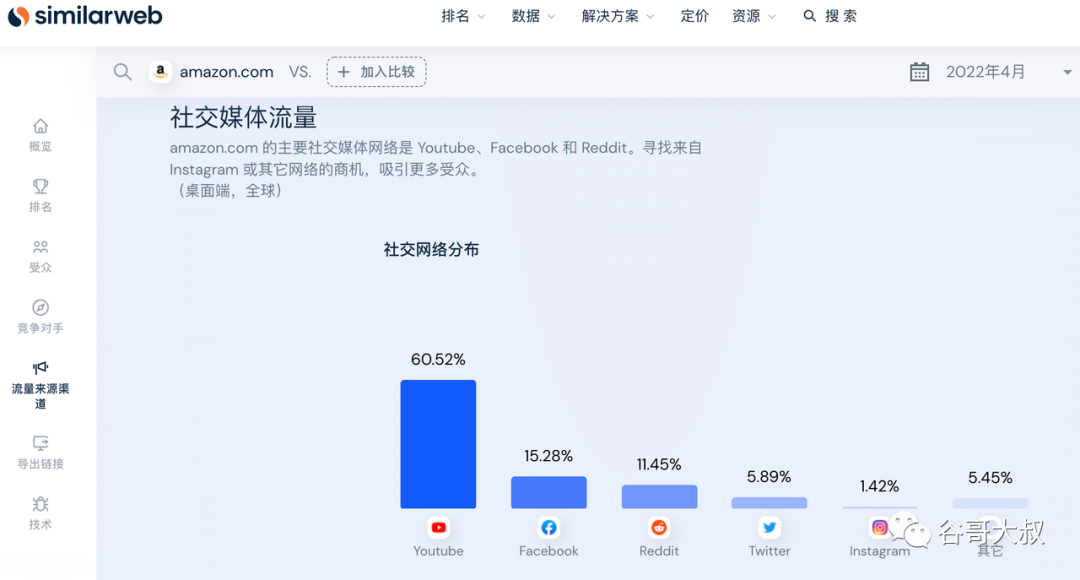 想知道自己网站的社交媒体的流量分布吗?可以使用SimilarWeb(访问地址:https://www.similarweb.com/)的工具来分析流量来源。如果你想知道你的竞争对手社交平台的流量都是来自哪些平台的话,也可以使用SimilarWeb工具查看。
