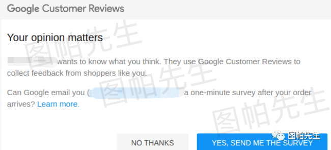 代码设置好后,每当用户下单成功,谷歌就会发送问卷提示,询问客户愿不愿意参加评分,如果愿意,就会预计收货日期前后发问卷给客户。